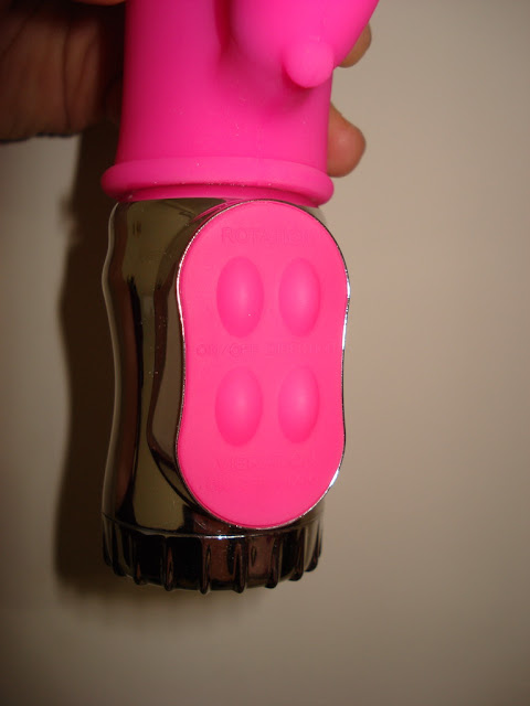 下排左按鈕是小兔子陰蒂按摩器的電源開關,下排右按鈕能調節強度(有強與弱兩種)。